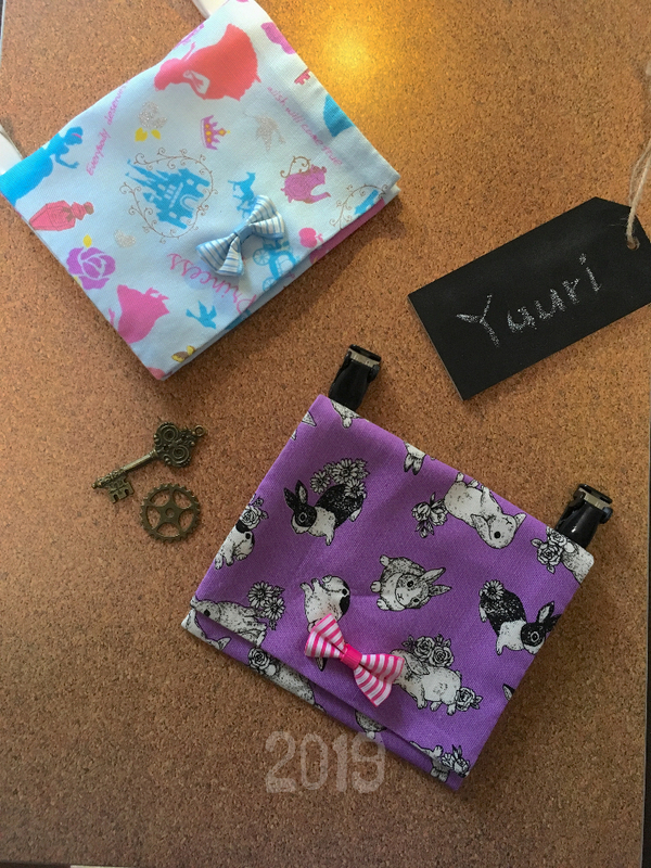 娘のために、移動ポケットを2つ作りました。プリンセス柄(娘の希望)とウサギ柄(母の趣味)です。ご存じのかたも多いと思いますが、ティッシュケースとハンカチを入れるポケットがあり、上部のクリップでスカートなどのボトムスに取り付けられるものです。